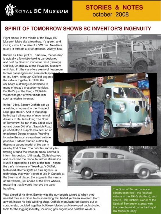 There are not many pictures of the car during construction, in fact I do not have any as yet. This web page from the Royal British Columbia Museum shows one of the rare pictures of the car without the body panels but includes the mid mounted engine. The lower picture was taken during the early years, and the middle picture is as it looks today sitting in the lobby of the museum. Rob Oldfield is pictured with the car.